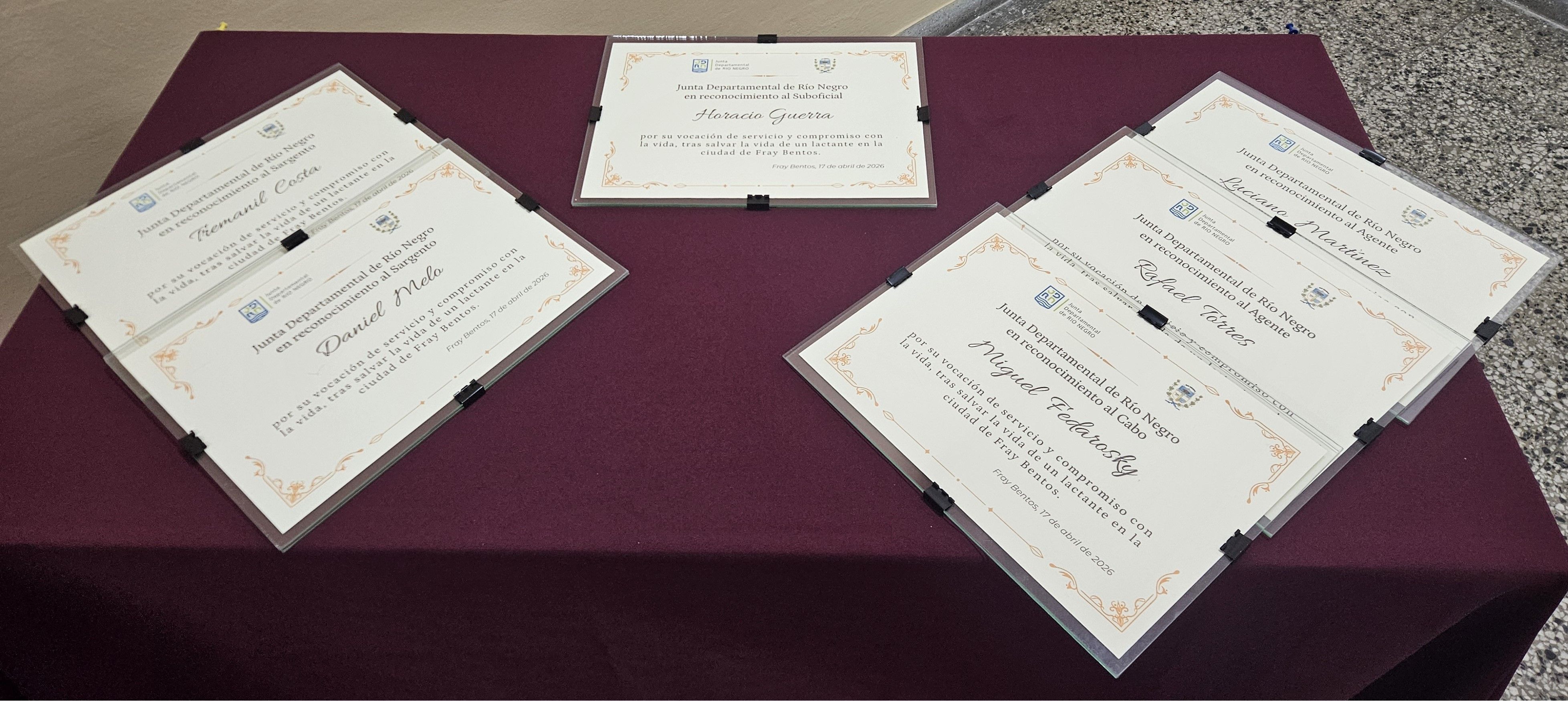 Los funcionarios reconocidos fueron: Suboficial Horacio Guerra, Sargento Tremanil Costa, Sargento Daniel Mello, Cabo Miguel Fedarosky, Agente Luciano Martínez y Agente Rafael Torres, pertenecientes a la Seccional Segunda de la Jefatura de Policía de Río Negro, quienes intervinieron de forma inmediata y profesional en dos oportunidades críticas, logrando salvar la vida de un lactante en situación de riesgo.